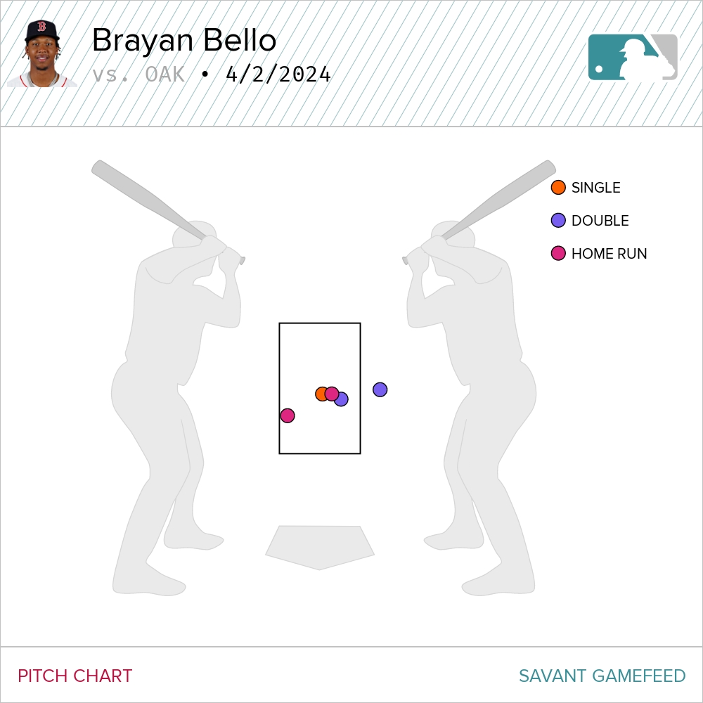 Much like most Athletics fans these days, Brayan Bello doesn’t like the site of the Oakland Coliseum. Last July, Bello pitched in Oakland and gave up 6 ER, including 3 HR. Tuesday night, he allowed two more home runs and four runs total. 10 ER over 9 IP in his last two appearances (10.00 ERA). Spooky! Look at the chart below. When Bello missed over the middle of the plate, he got crushed.